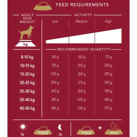 Au dos du sac, vous verrez un tableau des aliments avec le poids de votre chien sur la gauche. Dans la première ligne, en haut, vous voyez le niveau d’activité de votre chien. Regardez le poids de votre chien et son niveau d’activité, combien de grammes votre chien peut manger par jour. Vous répartissez ensuite ce montant sur 2 repas. Exemple : votre chien pèse 23 kg et n’est pas du tout actif ? Ensuite, il est autorisé à manger 290gr par jour, ce qui est converti en 2 repas de 145gr chacun.