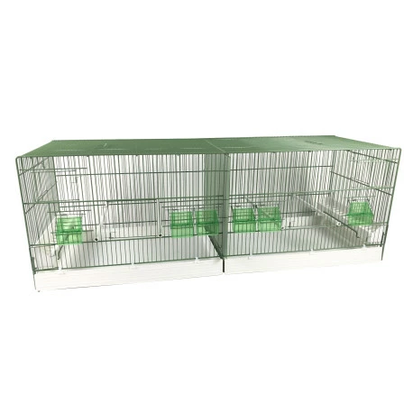 La face avant de la cage est composée de 4 portes (2 portes d’accès et 2 portes conçues pour mettre un nid), de 4 mangeoires vertes et de 2 longues mangeoires linéaires.