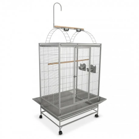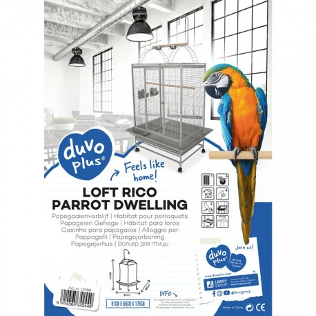 Cette cage spacieuse et résistante Rico pour perroquets est équipée d`un toit ouvrant avec une zone de jeu sur le toit. Avec 4 abreuvoirs/mangeoires et 2 perchoirs. Sans oublier un tiroir en métal et un bac de collecte pour les saletés. La cage est facile à déplacer grâce aux 4 roulettes.