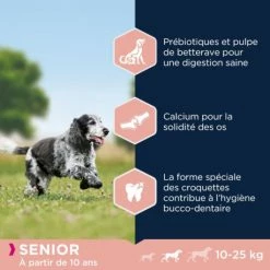 Riches en poulet frais, les croquettes Eukanuba sont idéales pour les chiens seniors de races moyennes âgés de 10 ans et plus. Les ingrédients sélectionnés offrent une alimentation conçue spécialement pour favoriser la condition physique optimale et la mobilité de votre chien senior. Les croquettes Eukanuba contiennent de la L-carnitine, qui contribue à la réduction de la masse grasse et permet à votre compagnon de conserver un poids idéal, et ainsi d’atténuer la pression sur les articulations. Le mélange de fibres sur mesure, composé de prébiotiques FOS, MOS et de pulpe de betterave, favorise une digestion saine. Les croquettes Eukanuba renforcent par ailleurs la santé de la peau et la brillance du pelage, grâce aux sources naturelles d’oméga 6 et d’oméga 3. La glucosamine et la chondroïtine aident à conserver des articulations saines et une bonne mobilité, tandis que le calcium favorise la solidité des os. Cette recette renferme également des vitamines E et C antioxydantes qui aident à renforcer le système immunitaire du chien. De plus, les croquettes Eukanuba hexagonales uniques, associées à la technologie DentaDefense, contribuent à l’hygiène bucco-dentaire à long terme. Cette recette est 100 % complète et équilibrée. Une alimentation de haute qualité adaptée aux chiens seniors de races moyennes assure à votre compagnon une condition physique optimale et une vie pleine de santé.