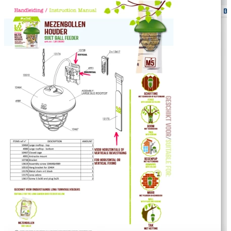 LONA M5 est un silo d’alimentation pour oiseaux Pour les petits oiseaux de jardin comme les mésanges, les pinsons, les moineaux et les espèces similaires. Facile à fixer à un piquet, tronc d’arbre, clôture, mur ou pergola. Idéal pour administrer des boules de graisse aux oiseaux sauvages.