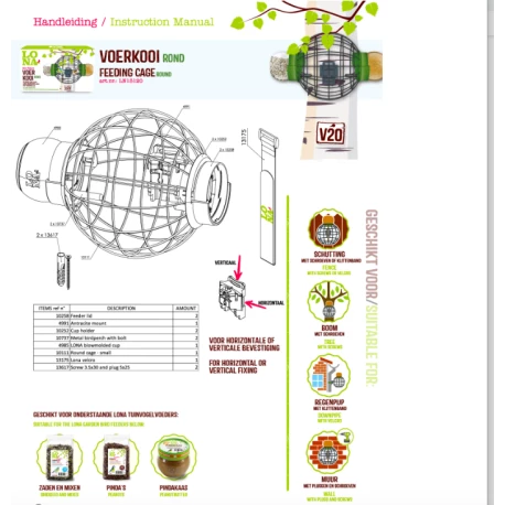 LONA V20 est une cage d’alimentation ronde qui protège les petits oiseaux de jardin contre les prédateurs naturels tels que les chats et les grands oiseaux, leur permettant de se nourrir en toute tranquillité. Nourrissez les oiseaux avec plusieurs aliments à la fois avec les 2 unités d’alimentation. Le V20 peut également être utilisé avec du beurre d’arachide LONA. Une vue fantastique! Et les oiseaux adorent le beurre d’arachide LONA.