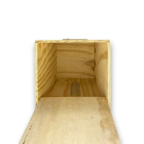 Nichoir en contreplaqué de pin, un produit extrêmement solide avec une grande résistance à l’eau. Perchoir en bois de hêtre. Avec échelle à l’intérieur de l’habitacle.