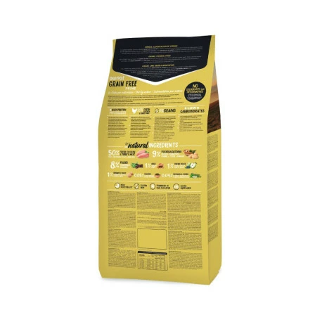 Poulet frais* (min. 25% avant l’extrusion), dinde fraîche* (min. 25% avant l’extrusion), poulet déshydraté (14%), petits pois entiers* (7%), graisse de volaille (préservée avec des antioxydants naturels), racines de manioc* (5%), poissons déshydratés (anchois du Pérou, chinchard et maquereau), porc déshydraté (4%), pomme de terre déshydratée* (4%), œuf déshydraté* (1%), huile de poisson (préservée avec des antioxydants naturels), protéines de poulet hydrolysées, pulpe de betterave, pomme* (1%), gousse de caroube* (1%), luzerne déshydratée*, levure de bière* (1%), sel gemme*, fructo-oligosaccharides et mannane-oligosaccharides, algues marines déshydratées* (500 mg/kg), glucosamine (500 mg/kg), yucca schidigera, chondroïtine sulfate (100 mg/kg), airelles* (100 mg/kg), thym* (80 mg/kg), fleur de camomille* (80 mg/kg), fenouil* (80 mg/kg), échinacée* (80 mg/kg), thé vert* (80 mg/kg). *INGRÉDIENTS NATURELS.